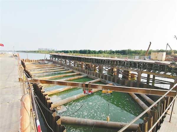 “七一路跨沙颍河桥是中心城区跨度最大的桥梁,两个主桥墩之间跨度达145米。桥主墩钢围堰完成封底,这是整个桥梁施工中的一个重要节点。”七一路东延工程项目经理盛铭介绍,七一路东延工程项目于2019年11月开工建设,截至目前桥梁桩基已全部完成,北岸主桥封底已完成,引桥正在进行下部结构施工,承台已完成22个,墩柱完成16个。道路灰土完成20万平方米,雨污水管道完成1000米,综合管沟累计开挖620米。