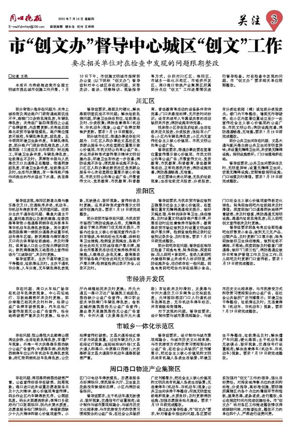 本报讯 为持续推进我市全国文明城市提名城市创建工作开展,7月10日下午,市创建文明城市指挥部办公室(以下简称“创文办”)督导组针对中心城区存在的问题,采取走访、座谈、明察暗访、现场指导等方式,分别对川汇区、淮阳区、市城乡一体化示范区、市经济开发区、周口港口物流产业集聚区所属部分点位“创文”工作进展情况进行督导检查。对在检查中发现的问题,市“创文办”要求相关单位限期整改。