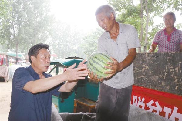 西瓜滞销,黄玉森看在眼里,急在心里。7月5日,他向乐服周口总编辑牛强求助。得知这一消息后,牛强第一时间与市委网信办副主任王霞取得联系,得到了市委网信办的大力支持。“坚决不能让瓜农因西瓜滞销伤心。这个忙我们一定得帮。”王霞说。随后,她联系了8家爱心企业,并于7月17日在太康县常营镇五子王行政村开展爱心购瓜公益活动。