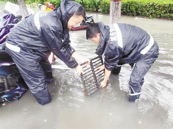 图为7月22日,商水县城管局应急人员在商庆路北段徒手对道路雨水管网排水口进行疏通。