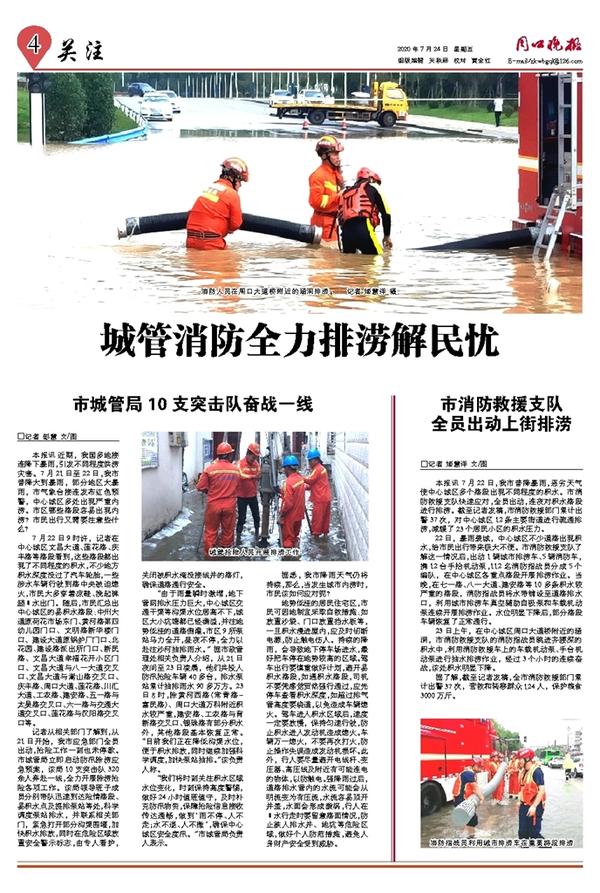 记者从相关部门了解到,从21日开始,我市应急部门全员出动,抢险工作一刻也未停歇。市城管局立即启动防汛除涝应急预案,该局10支突击队320余人奔赴一线,全力开展除涝抢险各项工作。该局领导班子成员分别带队迅速到达险情路段、易积水点及提排泵站等处,科学调度泵站排水,并联系相关部门,紧急打开部分沟渠围堰,加快积水排放,同时在危险区域放置安全警示标志,由专人看护,关闭被积水淹没接线井的路灯,确保道路通行安全。