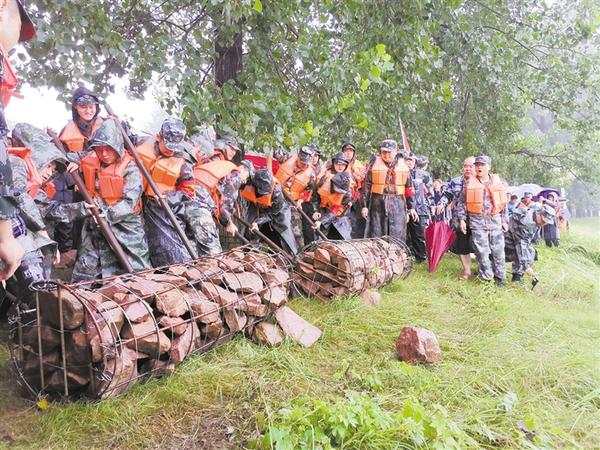 本报讯 7月26日9时,在沙河张埠口茅窝险工险段,周口2020年防汛抢险综合演练冒雨举行。川汇区人武部着眼汛情形势,紧贴民兵使命任务,在周口军分区、市应急防汛部门有力指导下,在川汇区区委、区政府正确指导下,区民兵应急分队、区应急管理部门和区水利部门专业队伍400多人联合开展了防汛抢险综合演练,有效锻炼提升了民兵应急队伍防汛救灾能力。周口军分区司令员汤维政、市应急管理局局长胡恩勇、川汇区委书记李宗喜、区长李湛等观摩演练。