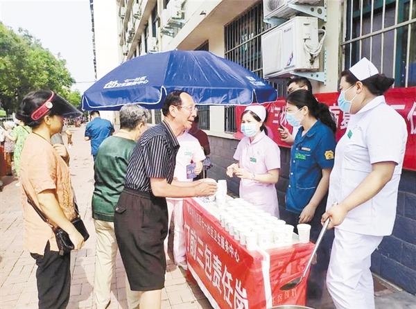 为弘扬中医药文化,提高群众身体素质,连日来,周口市第二人民医院七一社区卫生服务中心开展冬病夏治三伏汤免费饮用活动。图为医护人员正给市民讲解冬病夏治相关知识,并送上三伏汤。记者 宋馨 摄