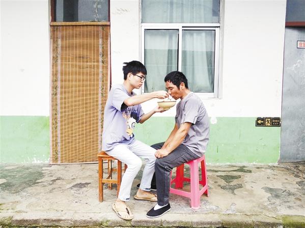 7月30日7时许,在沈丘县石槽集乡敬老院,17岁的邵万成给父亲喂完早饭后,捧起一本书,认真地读了起来。