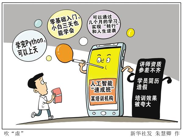 记者调查发现,这类机构往往存在讲师资质参差不齐、学员简历造假、培训效果被夸大等问题。专家认为,作为一个面向未来的产业,人工智能方兴未艾。但行业出现的“虚火”,也给了教培行业“投机取巧”的机会,消费者对此需要保持“冷思考”。