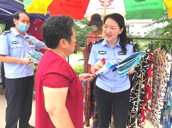 8月4日上午,骄阳似火,荷花路分局民警来到辖区内位于交通大道与龙源路交叉口附近的王响午行政村,正赶上村里有集市。“大爷,天热,拿个扇子扇扇吧,你看这上面还有好多防诈骗知识,要是陌生人给你打电话,说你中奖了让你转钱,可别信啊”“小朋友,给你一支圆珠笔,这上面还有防诈骗的漫画,可有意思啦……”在集市上,民警们一边向摊主和过往行人发放宣传单、扇子和圆珠笔,一边向村民讲解新型电信诈骗的手段和方式,提醒村民不要轻信中奖、转账等诈骗信息,一旦发现可疑情况,应立即向公安机关报案。正在卖蒜的村民雷大爷说:“这个活动举办得好,给我提了个醒,不贪小便宜就不会上当。”