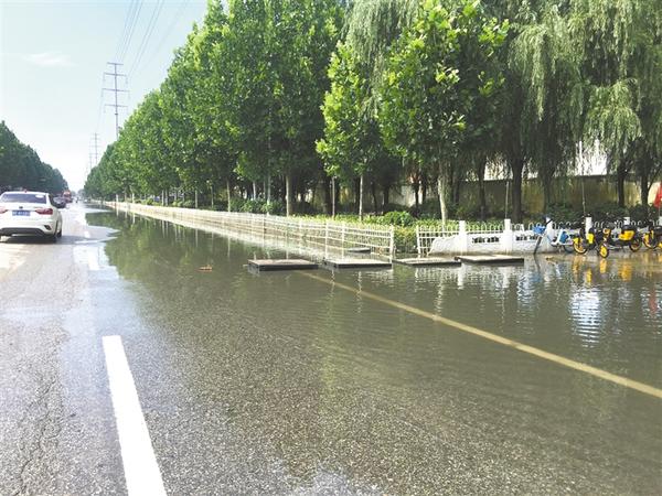 本报讯 8月4日,有市民向本报反映,在中心城区太昊路和朝阳路交叉口附近(康楼社区前)的道路上有大量积水(如图),部分地方积水甚至已经没过绿化带。