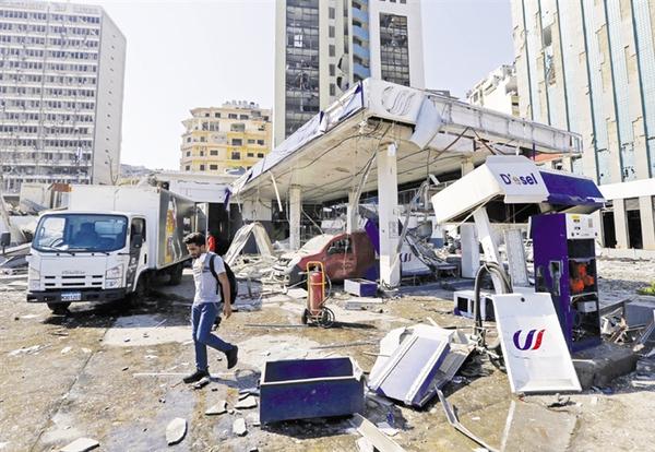8月5日,在黎巴嫩首都贝鲁特,行人从被爆炸破坏的加油站前走过。