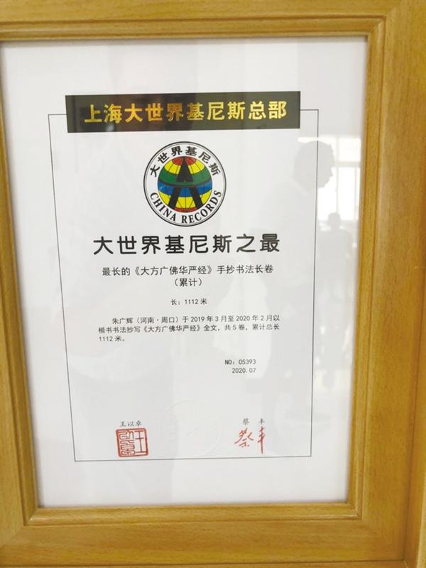 据介绍,该手抄长卷展出后社会反响强烈,上海大世界基尼斯总部工作人员查民华主动联系朱广辉,并告知其所抄的《华严经》经专家、评委评审后,收录到上海大世界基尼斯总部中国之最名录,并颁发证书。