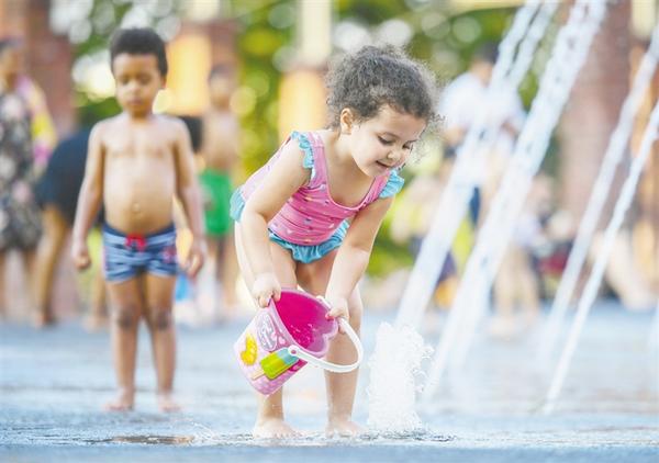 当地时间8月8日,一名儿童在德国法兰克福一处喷泉内戏水。 当日,法兰克福遭遇高温天气,最高气温达37摄氏度。 新华社记者 逯阳 摄