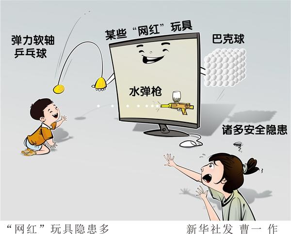 巴克球、水弹枪、弹力软轴乒乓球……这个暑期,被网络社交平台带火的“网红”玩具,成为不少孩子在家玩耍的新宠。虽然名气大、买家多,但一些“网红”玩具其实是粗制滥造的“三无产品”,记者在调查中发现诸多安全隐患。新华社发 曹一 作