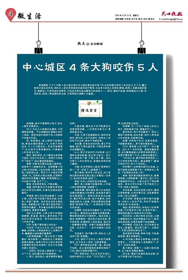 新闻摘要:8月4日晨,4条大狗在周口中心城区建安路不到700米的范围内咬伤5名市民。8月5日,警方接受记者采访时称,狗的主人答应承担被咬伤者的医疗费用,也会将几条咬人的狗处理掉。狗是人类最忠诚的朋友,能够给人们带来欢乐和陪伴,已经成为我们身边最常见的动物之一。然而,遛狗不拴绳、狗狗随地大小便、乱吠扰民、狗咬人等现象经常出现,文明养狗已显得十分重要。