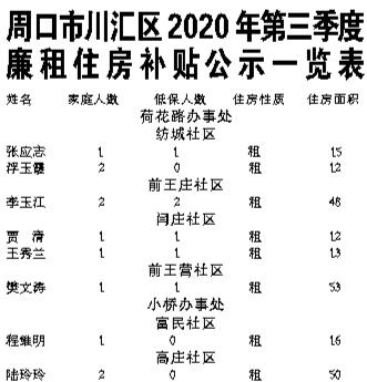 周口市川汇区2020年第三季度廉租房住房补贴公示一览表