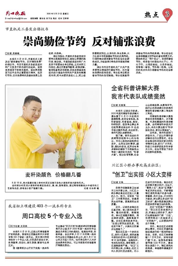该村部分村民把小麦秸秆晾晒后染成红、黄、绿、蓝等颜色,通过网络销售到大中城市的工艺装饰品店,使每亩小麦产值翻几番。 记者 付永奇 摄