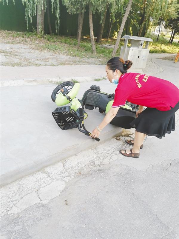 在几天的工作中,刘玉英发现路边的共享单车、共享电动车,有乱停乱放的情况,她一边记录下相关情况,一边把可以解决的问题现场进行处理,并及时将情况推送到“周口市文明观察工作群”。