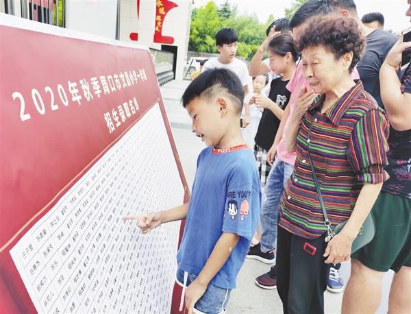 8月24日上午,周口文昌小学2020年秋季一年级新生名单出炉,不少家长和孩子在学校大门外查看录取名单。另外,该小学贴出通知,请被录取学生在8月27日上午到学校领录取通知书。 记者 孙安平 摄
