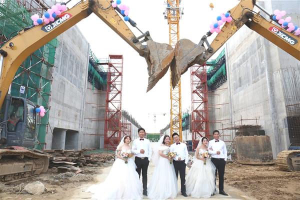 当日17时30分,伴随着钢筋与混凝土的协奏曲,新人们乘坐着由运载车改造而成的特殊“婚车”,缓缓驶过由两辆挖掘机组成的“同心门”,驶向他们两年来挥洒过汗水的船闸,在150余名工友的祝福声中,带着幸福的微笑,共同许下“永结同心”的白首之约。