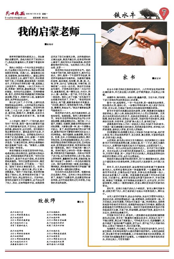我常常怀着深深的感恩之心,思念着我的启蒙老师。是他为我打开了知识的大门;是他在我童稚的心灵里播下希望的种子。