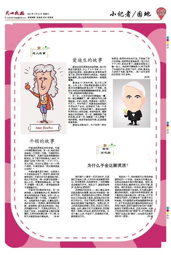 牛顿是世界闻名的科学家。牛顿小时候很喜欢动物。有一次,他的朋友送给他一只狗和一只猫,牛顿收到礼物非常高兴,无微不至地照顾着他的新朋友,为了便于狗和猫出入房间,牛顿在门边挖了两个洞,一个大一个小,有人问他,你为什么要挖一大一小两个洞呢,牛顿回答说:“狗从猫洞里能过去吗?”