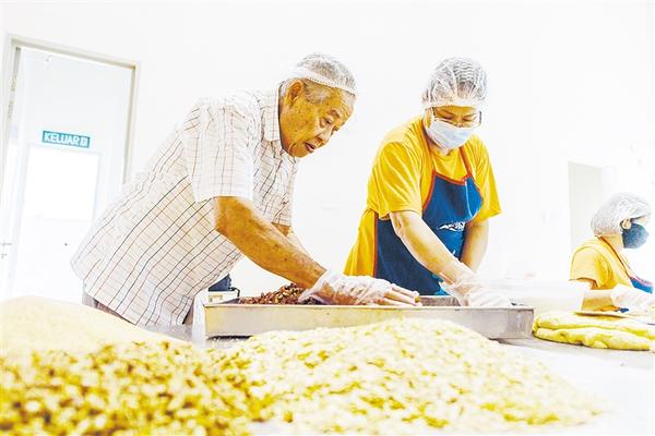9月21日,在位于马来西亚雪兰莪州塞里肯邦岸的“奇香”食品公司厂房内,许美声(左)和女儿许宝珠制作月饼馅料。