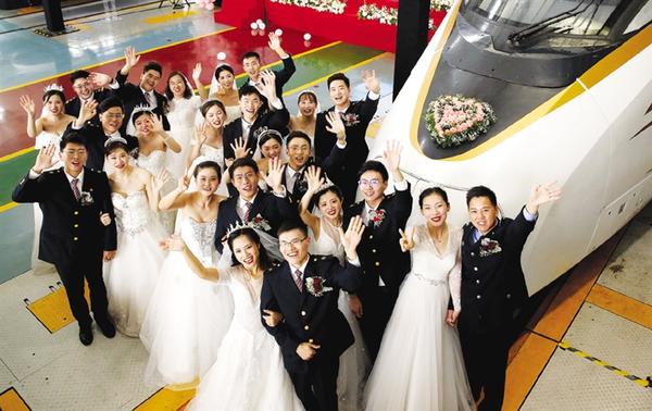 9月26日,参加集体婚礼的新人在高铁旁合影留念。