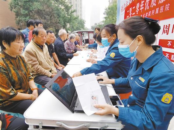 为满足社区居民基本医疗卫生服务需求,文昌社区卫生服务中心开展了“优质服务基层行”活动,组织医务人员走进小区,为居民进行免费健康体检,并建立健康档案。图为9月25日,医务人员在建业小区为居民测量血压,并建立健康档案。
