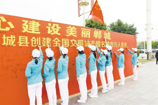 9月29日,郸城县举行2020年创建全国文明城市提名城市誓师大会。该县27个创建指挥部成员单位上千名工作人员誓师参战,与万名市民共同在“举全县之力创建文明城市 聚万众之心建设美丽郸城”签名墙上签名。该县号召全县上下要有“不负这片热土、不负这方百姓”的责任与担当,以“不破楼兰终不还”的坚定决心,以“狭路相逢勇者胜”的奋斗姿态,万众一心,顽强奋斗,攻坚克难,干在实处,全力以赴做好各项工作,确保圆满完成“创文”任务,以创建成果惠及全县人民、造福全县人民。记者 徐松 摄 ②9
