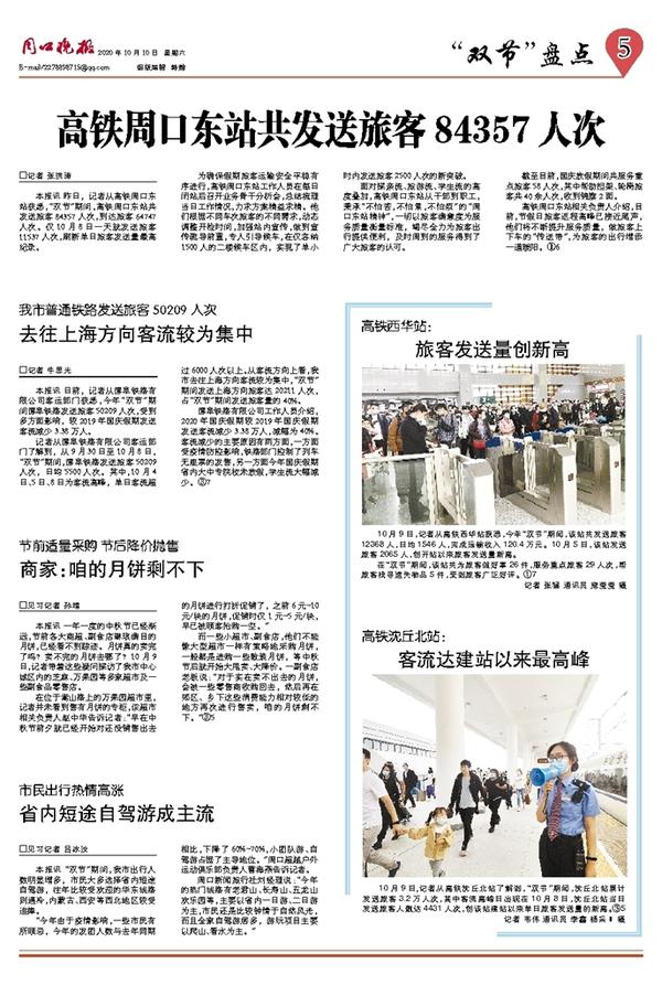 记者从漯阜铁路有限公司客运部门了解到,从9月30日至10月8日,“双节”期间,漯阜铁路发送旅客50209人次,日均5500人次。其中,10月4日、5日、8日为客流高峰,单日客流超过6000人次以上。从客流方向上看,我市去往上海方向客流较为集中,“双节”期间发送上海方向旅客达20211人次,占“双节”期间发送旅客量的40%。