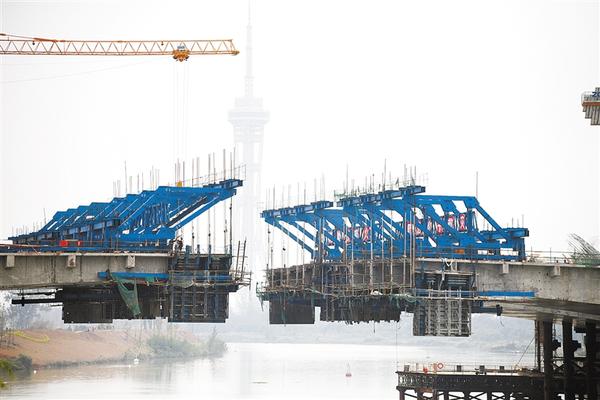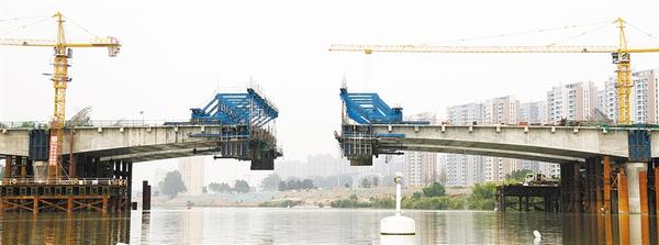昨日,记者在中心城区中原路跨沙颍河大桥施工现场看到,工人正在紧张施工,目前,仅剩两段桥体未建成,据了解,工程全部完工预计还需一个月。