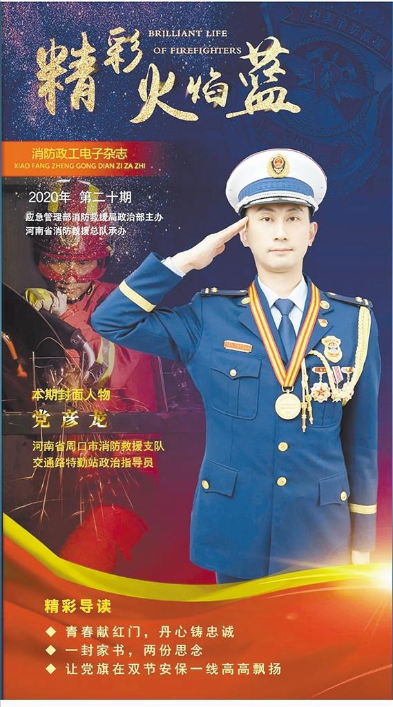 在最近一期《精彩火焰蓝》电子杂志上,封面人物是来自周口消防救援支队交通路特勤站政治指导员党彦龙。该电子杂志封面人物主要介绍 “河南省最美消防人”、“河南省人民满意的政法干警”、河南省“优秀人民警察”等优秀人物。