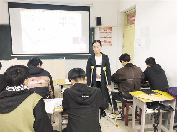 本报讯 “哒,哒,哒……”随着拐杖敲打地面的声音越来越近,一位拄着拐杖、身上背着双肩包的教师缓慢地挪进了教室。顿时,教室里响起阵阵掌声。讲台上,“拄拐教师”左腿单膝跪在椅子上,右腿则单腿站立,授课场景令学生既心疼又欣喜。