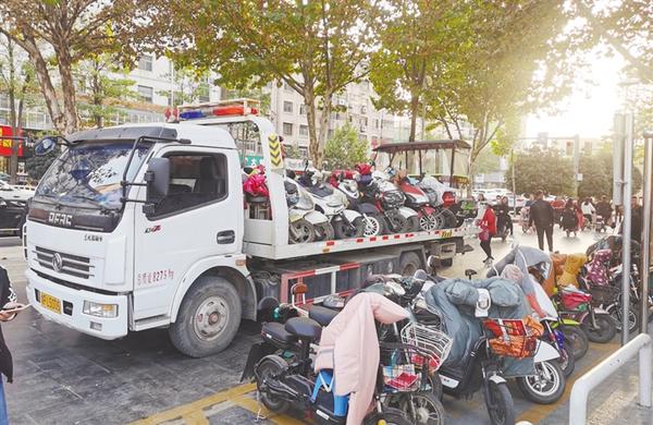 11月8日,因中心城区五一文化广场南侧车辆乱停乱放现象严重,影响市容市貌及行人通行,周口市城市管理局对该路段进行整治,并在明显位置设置通知牌,告知市民非机动车免费停放区域。图①为周口市城市管理局工作人员清理乱停乱放的车辆;图②为清理后的道路。记者 孙安平 摄
