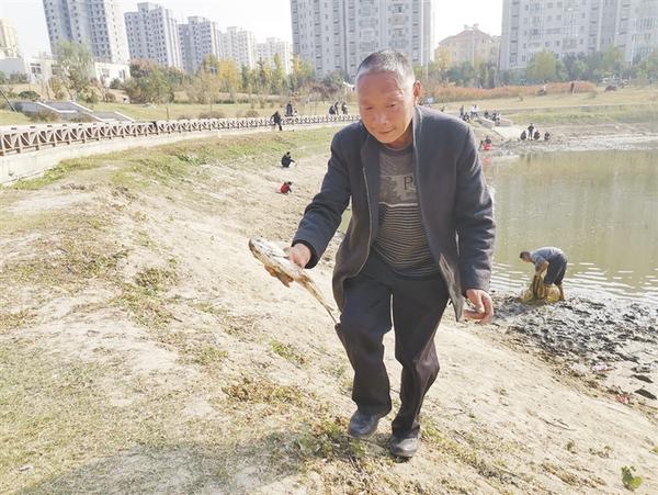 11月9日中午,一市民从开发区人民广场的明镜湖捉鱼。昔日这里波光粼粼,现在水去湖干,一片萧条景象。