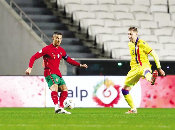 11月11日,葡萄牙队球员克·罗纳尔多(左)在比赛中。