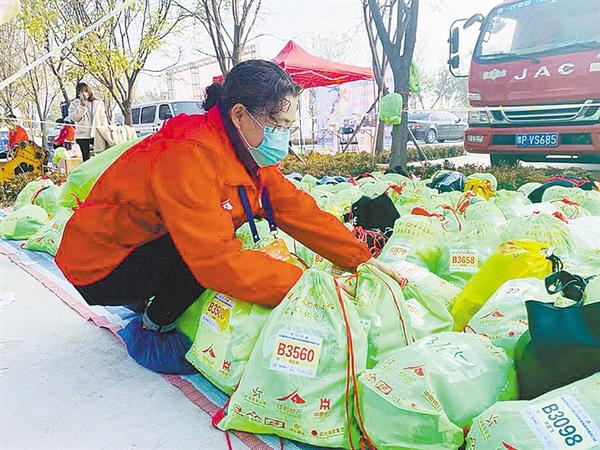 在存包处,志愿者正在整理参赛选手的背包(如图)。在起点两侧,志愿者举着为2020周口马拉松选手加油的牌子,高声喊着“周口,加油、周口,加油……”参赛选手跑过起点,志愿者开始清理起点处的垃圾。“我5点多就到这了,做些举手之劳的事情,助力周口马拉松。”正在捡垃圾的志愿者理霞说。