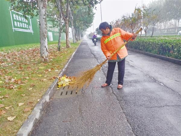 11月17日,记者在周口中心城区七一路看到,一名环卫工人正在清扫路面的落叶。当日,周口中心城区下起了雨,雨越下越大,宽敞的马路上,落下一片片湿漉漉的枯叶,严重影响了市容环境卫生,环卫工人并未因为下雨休息,而是冒雨认真清扫落叶,默默为城市发展贡献力量。
