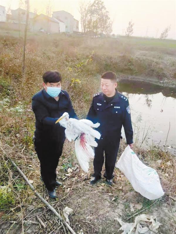 本报讯 11月16日,商水县化河乡南马行政村老梨园村村民发现一只受伤的白鹭,村民报警后,商水县公安局森林公安民警连夜送治。