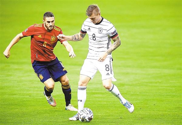 11月17日,西班牙队球员科克(左)与德国队球员克罗斯在比赛中拼抢。