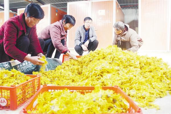 11月19日,在商水县郝岗镇大路李村金丝皇菊种植合作社,镇干部杨占民(右二)了解贫困户金丝皇菊种植情况。该镇在脱贫攻坚中,杨占民积极牵线搭桥,帮助大路李村委负责人李华生引进种植金丝皇菊,带动贫困户脱贫致富。记者 付永奇 通讯员 吕耀光 摄