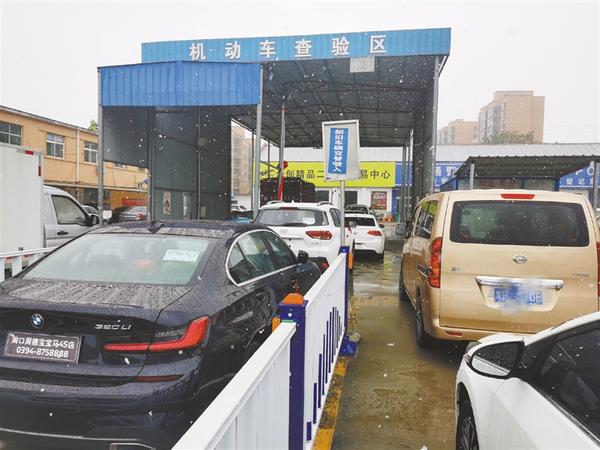 11月23日11时许,天空飘起片片雪花。寒冷的天气未能阻挡车主的热情,八一大道合创服务点机动车检测线仍有不少车辆等着审车。市民王先生的爱车今年已经“7岁”了,本来想着来给车辆审车,但被告知不用审了,他很快就拿到了机动车检验合格标志。“只知道是有新规要实施,但没想到赶这么巧。”王先生说。