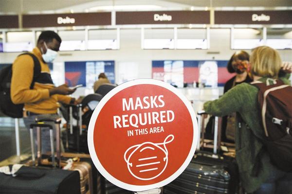 11月24日,在美国弗吉尼亚州阿灵顿的里根国家机场,戴口罩的旅客们站在一处要求佩戴口罩的标识旁。随着感恩节临近,美国疾病控制和预防中心发布指南,呼吁民众不要在感恩节假期出行,以降低感染和传播新冠肺炎的风险。尽管如此,数百万美国民众仍选择在此期间出门。据美国交通安全局统计,上周末仅通过乘飞机一种方式出行的就有超过三百万人。 新华社发