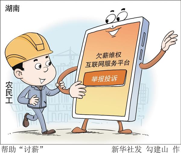 记者11月26日从湖南省人社厅了解到,为拓展农民工欠薪投诉举报线索采集电子服务渠道,湖南省人社厅建成了直接面向农民工群体的欠薪维权互联网服务平台,农民工只需要在网上一点举报投诉,即可全省联动帮助“讨薪”。