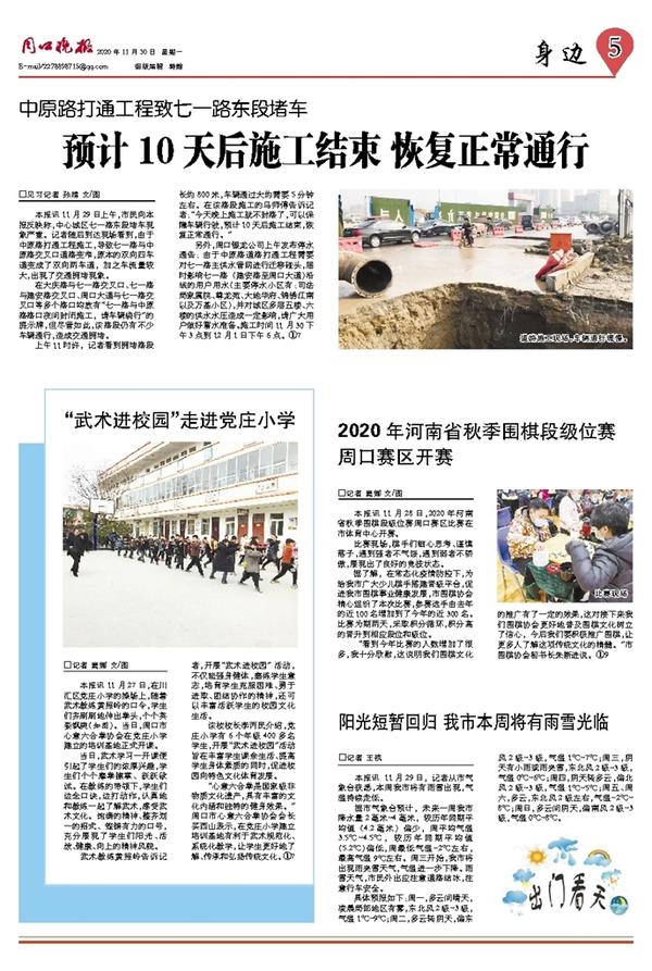 另外,周口银龙公司上午发布停水通告: 由于中原路道路打通工程需要对七一路主供水管网进行迁移碰头,届时影响七一路(建安路至周口大道)沿线的用户用水(主要停水小区有:司法局家属院、尊龙苑、大地华府、锦绣江南以及万基小区),并对城区多层五楼、六楼的供水水压造成一定影响,请广大用户做好蓄水准备。施工时间11月30下午3点到12月1日下午6点。①7