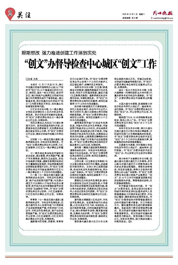本报讯 11月17日至20日,周口市创建文明城市指挥部办公室(以下简称市“创文”办)三个督查组分别对川汇区、淮阳区、城乡一体化示范区、经济开发区、港口物流产业集聚区文明城市创建工作开展情况进行了督导检查。通过督查发现,部分创建点位仍存在对“创文”工作要求落实不到位、没有建立长效管理机制等问题。