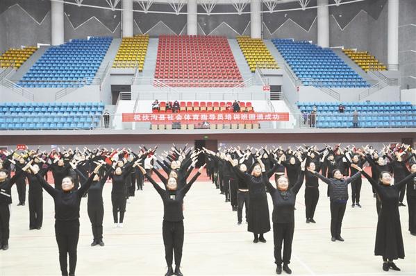 本报讯 11月28日~29日,扶沟县举办2020年健身操舞项目社会体育指导员培训班。培训班由扶沟县教育体育局主办,扶沟县体育中心承办,共有来自全县各乡镇(街道)的300余名学员参加培训(如图)。