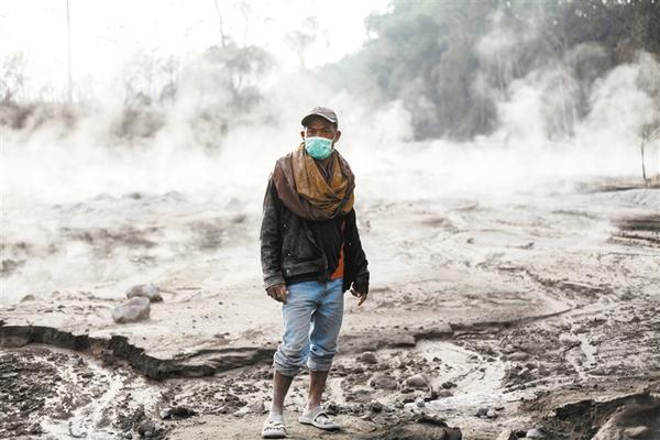 12月2日,在印度尼西亚东爪哇省卢马姜地区,一名面戴口罩的当地居民站在仍有余温的火山灰上。 12月1日,位于印尼东爪哇的塞梅鲁火山喷发,随之而来的火山灰将火山附近卢马姜地区的多个村庄覆盖,当地部分居民撤离。新华社发