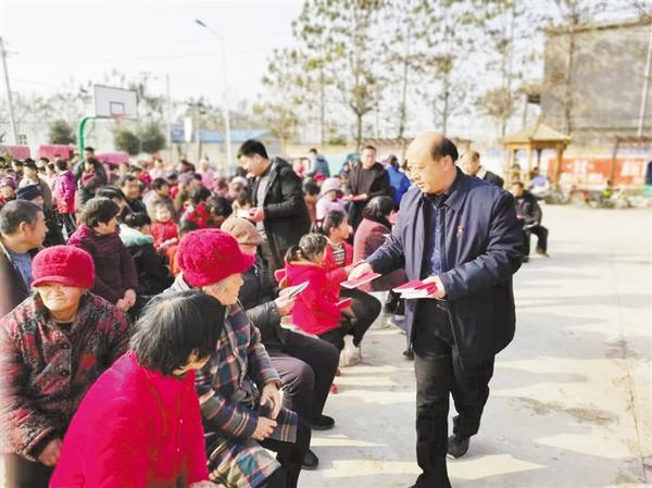 节目演出前,周口市委政法委驻村干部李金杯,郸城县司法局局长张天社、副局长王亚东,汲冢镇镇长梁程飞、政法委员邓曼向在场的1000多名群众发放宪法、民法典、法律进农村、法律进家庭等大量宣传资料(如图)。