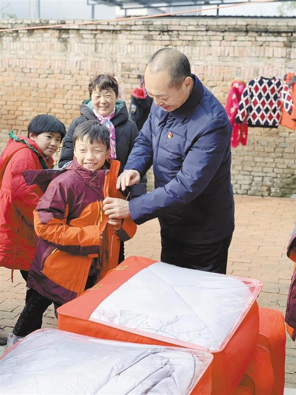 方凯得知这一消息后,立即安排工作人员购买价值近万元的16条棉被、16件棉衣和其他生活用品。他冒着寒风带领部分工作人员将这些物品送到孩子们的手中,并亲手为孩子们穿上崭新的棉衣(如图)。