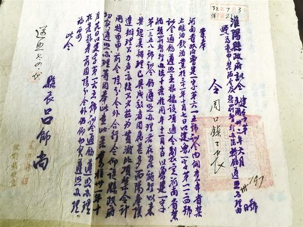 缓缓展开这份“禁酒令”,只见上面写着:“……遵照并根据该项通令制定河南省禁酒惩罚暂行办法十条……”等内容,均用毛笔书写而成,还有“县长吕师尚”“令周口镇镇长”等字样,落款时间为民国31年,并盖有“淮阳县政府”篆字官印。经查阅《淮阳县志》,关于“县长吕师尚”的情况没有太多记载。