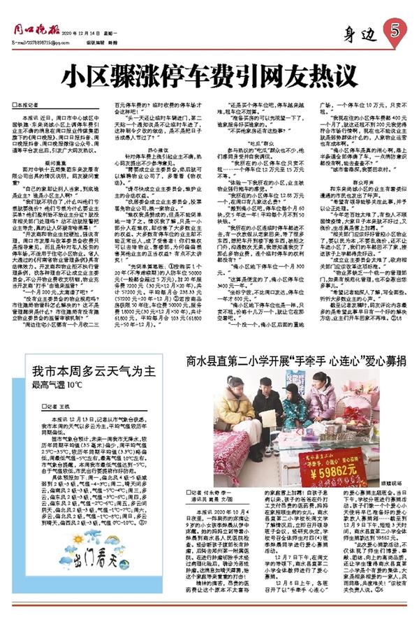 本报讯 近日,周口市中心城区中国铁建·东来尚城小区上调停车费引业主不满的消息在周口报业传媒集团旗下的《周口晚报》、周口日报抖音、周口晚报抖音、周口晚报微信公众号、周道等平台发出后,引发广大网友热议。